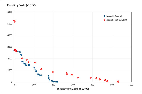 Moreover, Figure 4 show a Pareto front that represents the results of multi-objective optimization obtained by Ngamalieu-Nengoue et al. [17] and the results obtained in a multi-objetive optimization using a NSGA-II with hydraulic controls. It is observed that the Pareto front improves significantly compared to previous studies, even when the flood is removed from the system. It should be noted that for the zero investment costs, the hydraulic control allow to reducing the flooding costs almost to the half (from 5,236,200€ to 2,701,858€). This demonstrates the convenience of including hydraulic controls in the optimization model.
