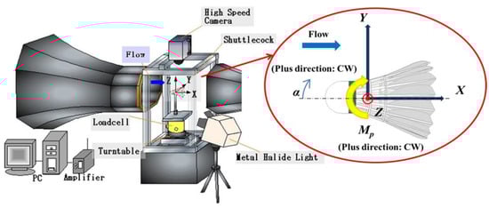 Figure 1 shows the experimental apparatus and the experimental setup for the fluid force measurements and flow visualization system. The wind tunnel experiment was carried out in a low-turbulence wind tunnel at the Institute of Fluid Science, Tohoku University, Japan. The test section was octagonal and 0.29 m by 0.29 m (height by width); experiments were performed in an open area in the center of the test section. The turbulent intensity was 0.4% or less of the main shuttlecock. The coordinate system is right handed and the coordinate origin is defined as the center of mass of a shuttlecock. The velocity is denoted by the components (u, v, w) in the directions (X, Y, Z). The test model was the feather shuttlecock and the synthetic shuttlecock (NEW OFFICIAL and MAVIS2000, YONEX Co., Ltd., Tokyo, Japan). YONEX feather shuttlecock is the official choice for the world’s leading international tournaments. The shuttlecock test models are shown in Figure 2, and the representative dimensions are given in Table 1. The surfaces of each of the shuttles was painted black to suppress halation during the visualization experiment. The aerodynamic forces on the shuttlecock were measured by using a three-component force balance (LMC-3501-50N, NISSHO-ELECTRIC-WORKS Co., Ltd. Tokyo, Japan) and strain amplifiers (DSA-100A, NISSHO ELECTRIC WORKS) connected to a shuttlecock support. The balance was able to simultaneously detect the lift, drag, and pitching moment. The equipment used for motion analysis experiments were high-speed cameras (FASTCAM SAX 2, Photron Ltd., Tokyo, Japan) and metal halide lights (HVC-SL, Photron Ltd.). The Reynolds number Re was defined as