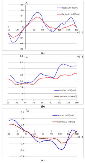 Aerodynamic coefficients of the feather shuttlecock and the synthetic shuttlecock as a function of the angle of attack at U0 = 30 m/s (Re = 1.3 × 105). (a) Lift coefficient curves, (b) drag coefficient curves, and (c) pitching moment coefficient curves.
