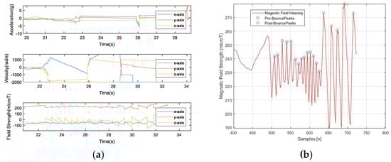 (a) IMU sensor readings of a spinning ball (acceleration—top, gyroscope—middle and magnetometer—bottom); (b) pre-bounce and post-bounce peaks of a spinning ball for the magnetometer.