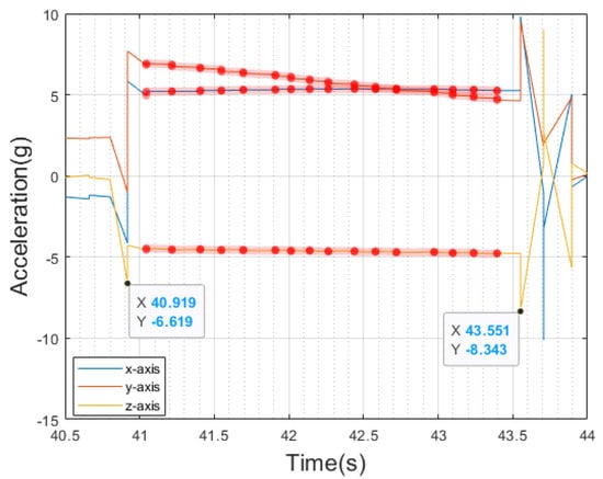 The angular velocity of the ball was calculated from the gyroscope and the average torque was analyzed using the peak acceleration. The peak time was calculated from the acceleration plot. This is indicated with red dots in Figure 5, which shows the flight time between two peak points (point of release and pitching).