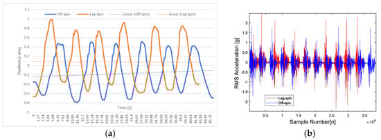 RMS acceleration of the wrist using IMU sensors sampled at 250 Hz: (a) accelerometer readings of off-spin balls; (b) accelerometer readings of leg-spin balls.