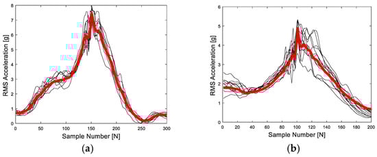 Several superimposed bowls with an IMU located on the bowler’s wrist are shown in Figure 8. The red line in both plots indicates the average root mean square (RMS) acceleration of all bowls. A higher acceleration (7.5 g) can be observed in leg-spin bowls (Figure 8a) when compared to the acceleration (5 g) of the off-spin bowls (Figure 8b).
