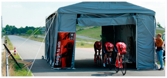 At cycling velocities beyond 15 km/h, the aerodynamic drag of an individual rider becomes the dominant resistance. In these conditions, more than 90% of the athlete’s power is expended to overcome the air resistance [1]. Most research on cycling aerodynamics has been carried out by force balance measurements to quantify the aerodynamic drag of individual riders for different riders’ positions or equipment [2]. More recently, some studies have been reported which investigated the flow mechanisms responsible for the aerodynamic drag [3]. However, in most race events, athletes ride in close proximity to each other, thus benefitting from a significant reduction in aerodynamic drag [4]. Some examples of multiple rider events include the team time trial in road cycling and the team pursuit and team sprint in track cycling. In these events, the effect of drafting on the aerodynamic drag is a key element in the pacing strategy, since drag optimization of each cyclist individual does not lead per se to the lowest drag for the group. The aerodynamic optimization of such a group must take into account three important elements: the spatial position of the riders, i.e., the longitudinal (in travelling direction) and sideways separations among riders [5,6]; the inter-individual size differences [7]; and finally, the athletes’ skills, and in particular how well the athletes are able to maintain their position and distance with respect to the preceding riders [8]. Currently, none of the state-of-the art techniques for investigating cycling aerodynamics (wind tunnel, Computational Fluid Dynamics and track measurements) is able to measure the effect of these three elements simultaneously nor optimize for them.