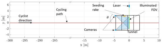A detailed top view of the experimental setup is given in Figure 2. Velocity data upstream and in the wake of the cyclists were collected by means of a large-scale stereoscopic-PIV system. Neutrally buoyant helium-filled soap bubbles (HFSB) with an average diameter between 0.3 and 0.4 mm were used as flow tracers [10], providing sufficient light scattering to visualize a field of view (FOV) of the order of 4 m2. A tunnel of 8 × 5 × 3 m3 in x, y and z direction (see Figure 1) was used to confine the bubbles near the measurement plane. The tunnel had an open in- and outlet to allow the rider to transit and was equipped with optical access on one side for illumination purposes. The tracers were introduced in the measurement region by a rake with 200 nozzles positioned 1 m upstream of the measurement plane, adjacent to the tunnel side wall. The light source was a Quantronix Darwin Duo Nd:YAG laser emitting a green light with a wavelength of 532 nm with a maximum pulse energy of 25 mJ at a repetition rate of 1kHz. The laser beam was shaped into a 50 mm thick sheet by means of laser optics and light stops. The field of view was imaged by two Photron Fast CAM SA1 cameras (CMOS, 1024 × 1024 pixels, pixel pitch of 20 μm, 12 bits) equipped with 35 mm objectives at f/2.8. Images were acquired at 0.5 kHz and 1 kHz for the individual and drafting measurements, respectively. The pair of cameras was placed 4 m upstream of the measurement plane in an angular-displacement stereo configuration, at a full stereoscopic viewing angle of 2θ = 95 degrees. The resultant field of view captured by both cameras is 1.8 × 1.8 m2, yielding a magnification factor of 0.011 and a digital image resolution of 0.57 px/mm.