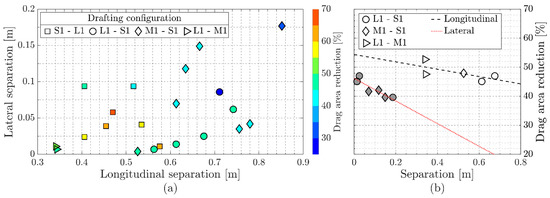 (a) Reduction in drag area for the drafting cyclist at different positions behind the lead cyclist. (b) Effect of longitudinal and lateral separations on the drag reduction of the trailing cyclist. The filled symbols correspond to varying lateral separation with a longitudinal distance of 0.65 m ± 0.04 m. The empty symbols correspond varying longitudinal separation with a lateral separation of 0 m ± 0.02 m.
