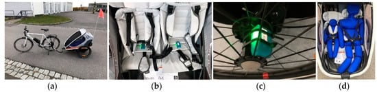 In this study, a two-wheeled bicycle trailer made by Hamax AS (Moss, Norway) was utilized. The trailer model Outback is in accordance with EN 15018 [5] and provides two seats for babies above six months of age and/or toddlers with a maximum height of 1.17 m or maximum weight of 22 kg. The carrying capacity is 42 kg, which includes the weight of passengers as well as luggage. The trailer runs on 20” wheels, which are linked through a steel spring suspension chassis to the aluminum frame. The towing bar of the trailer is connected to the left dropout of the bicycle rear wheel. The trailer was towed using a pedal electric bicycle (Multiroad Carbon, Storck Bicycle GmbH, Idstein, Germany). A tachymeter displayed the actual speed to the cyclist. A photograph of the harnessed team is displayed in Figure 1a.