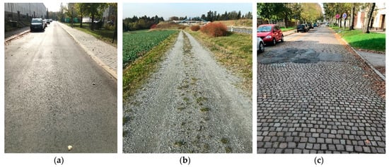 The data collection took place in the city of Chemnitz (Germany) in summer 2019. All rides were performed by the same cyclist on nearly flat tracks. The road surfaces were differently paved (see Figure 2a–c for details). As second independent variable, the load case was investigated. The WBV was studied for both of the dummies when being transported as single passenger as well as in combination with the second dummy. Furthermore, tire pressure was altered within three levels of the recommended range provided by the tire manufacturer (3.0, 4.0, and 5.0 bar). The tests were implemented performing also three different velocities (10.0, 17.5, and 25.0 km/h).