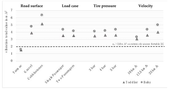 Whole-body vibration by means of vibration total values obtained at toddler and baby dummy in dependence on different road surfaces, load cases, tire pressures, and velocities. Vibration discomfort threshold value 2.0 m/s2 is indicated with a dashed line.