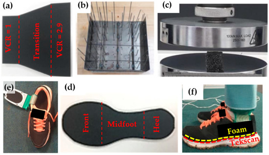 (a) Sheet of foam used for gradient fabrication; (b) mould used for fabrication; (c) quasi-static compression test; (d) cut out insole; (e) pressure sensors inserted into the running shoe, covered by a foam sample; (f) participant wearing instrumented shoes, foam insole and Tekscan, labelled in yellow and red, respectively.