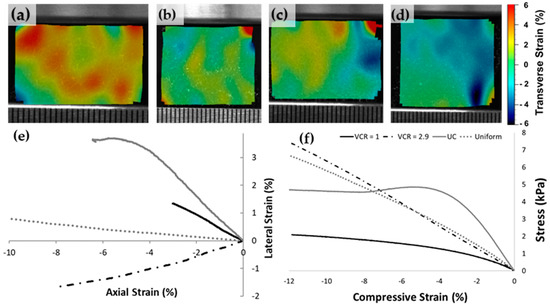 Contour plots from DIC of the lateral strain at maximum compression for: (a) unconverted foam; (b) isotropic, uniformly converted foam; (c) gradient foam with a VCR of 1; (d) gradient foam with a VCR of 2.9. Sample (e) lateral vs. axial strain and (f) stress vs. axial strain plots, same legend (d) for (a) to (d) and (f) for (e,f); UC = unconverted foam.