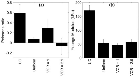 The unconverted foam’s lateral strain (Figure 2e) and stress (Figure 2f) plateaued beyond approximately 2% compression. The small amount of applied through-thickness compression (30%) in the gradient foam removed (Figure 2e) or reduced (Figure 2f) the respective lateral vs. axial strain and stress vs. strain plateaus for the region of foam with a VCR of 1.0. Increasing the VCR from 1.0 to 2.9 increased Young’s modulus (gradient of stress vs. strain plots). Poisson’s ratios were approximately 0.5 or 0.1 for the unconverted and uniform sheet, and 0.2 or −0.1 for regions of the gradient sheet with an applied VCR of 1.0 or 2.9, respectively (Figure 3a). Young’s modulus was 170 kPa for the unconverted foam and approximately 50 kPa for the three other foams (Figure 3b).