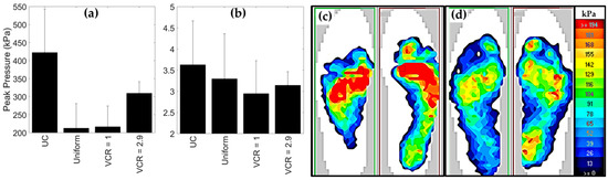 (a) Mean maximum peak pressure while participant A jumped on each sheet; labels VCR = 1 and 2.9 indicate which section of the gradient foam is underneath the heel. (b) Normalised peak pressure underneath each sheet (maximum peak pressure/maximum mean pressure). Error bars show 1 s.d. (c,d) Maximum pressure distribution at maximum total pressure while participant A jumped on the gradient foam, VCR = 2.9 section under (c) forefoot and (d) heel. Same legend for (c) and (d).