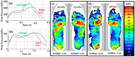 Participant B’s peak pressure over time underneath the (a) conventional and (b) uniformly converted insoles inside running shoes, with the same y axis scale for both, and pressure distribution at maximum total pressure underneath (c) conventional and (d) uniformly converted foam insoles inside a running shoe, same legend for both.
