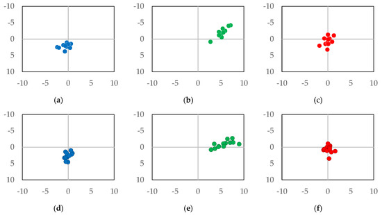 Sagittal (vertical axis) and horizontal (horizontal axis) components of the ball rotation of all participants: the result of the straight (a), curve (b) and knuckle (c) kicks in the pre experiment; the result of the straight (d), curve (e) and knuckle (f) kicks in the post experiment.