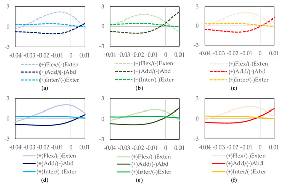 In the pre experiment, the values of the hip joint torque at the kick impact of the straight kick were flexion = 1.71 ± 0.81 Nm/kg, adduction = −0.56 ± 1.07 Nm/kg and internal = 0.22 ± 0.23 Nm/kg; curve kick was flexion = 0.67 ± 1.27 Nm/kg, adduction = 0.56 ± 1.17 Nm/kg and internal = 0.14 ± 0.17 Nm/kg; and knuckle kick was flexion = 1.45 ± 0.95 Nm/kg, adduction = −0.09 ± 1.06 Nm/kg and internal = 0.09 ± 0.22 Nm/kg (Figure 2a–c). In the post experiment, the values of the hip joint torque at the kick impact of the straight kick were flexion = 1.97 ± 0.56 Nm/kg, adduction = −0.37 ± 1.02 Nm/kg and internal = 0.26 ± 0.23 Nm/kg; curve kick was flexion = 1.09 ± 1.06 Nm/kg, adduction = 0.25 ± 0.80 Nm/kg and internal = 0.30 ± 0.20 Nm/kg; and knuckle kick was flexion = 1.52 ± 0.76 Nm/kg, adduction = 0.37 ± 1.16 Nm/kg and internal = 0.15 ± 0.19 Nm/kg (Figure 2d–f).