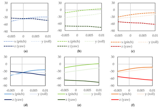 Euler angles ([degree]: vertical axis) of the mean transition value of all participants, expressed with time ([s]: horizontal axis) from the impact: the result of the straight (a), curve (b) and knuckle (c) kicks in the pre experiment; the result of straight (d), curve (e) and knuckle (f) kicks in the post experiment.