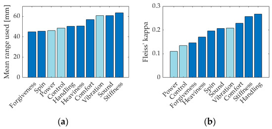 Bar plots for the 10 prominent sensory attributes of (a) mean range of the available scale used by testers and (b) Fleiss’ kappa values (power, control, and vibration highlighted in light blue).