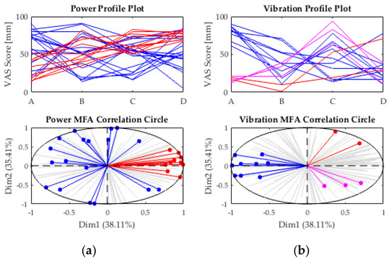 Profile plots, where each line represents the four ratings of one tester, and multiple factor analysis (MFA) correlation circles of (a) power and (b) vibration with particular clusters highlighted in blue, red, and magenta.