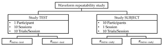 A similar methodology was used for the study SUBJECT for intra- and inter-subject repeatability using the data of one session for ten participants. Intra-subject repeatability coefficient () was studied by comparing each trial of the participant to his own mean trial (where is the th sample of the th trial of the th participant, is the number of samples per signal, is the number of trials per participant and is the number of participants). The inter-subject repeatability coefficient ( was studied by comparing all the trials of all the participants to the mean of all the trials of all the participant. In both studies (TEST and SUBJECT), an value greater than 0.8 was considered as good repeatability []. The waveform repeatability study is summarized in Figure 1.