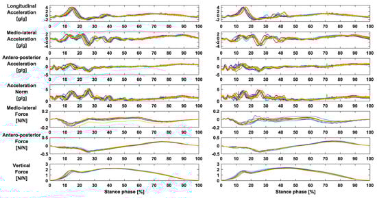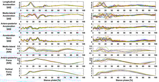 Normalized running signals for acceleration and force during stance for the study SUBJECT. Results for the intra-subject repeatability (ten trials of one participant—left) and for the inter-subject repeatability (one trial of each of the ten participants—right).
