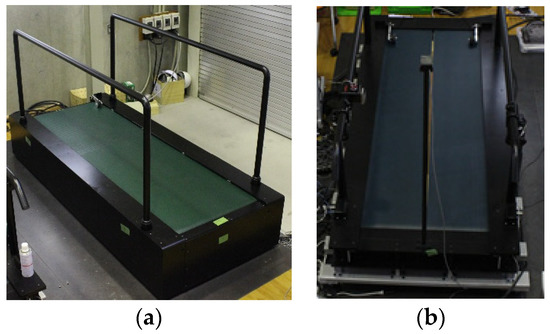 Treadmill installed with force plates. (a) A single-belt treadmill installed with a force plate. (b) The dual-belt type treadmill installed with two force plates.