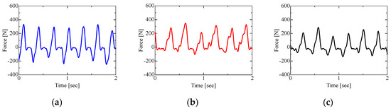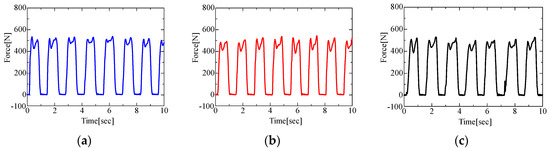 Results for vertical force in running conditions: (a) low target load; (b) medium target load; (c) constant belt speed.
