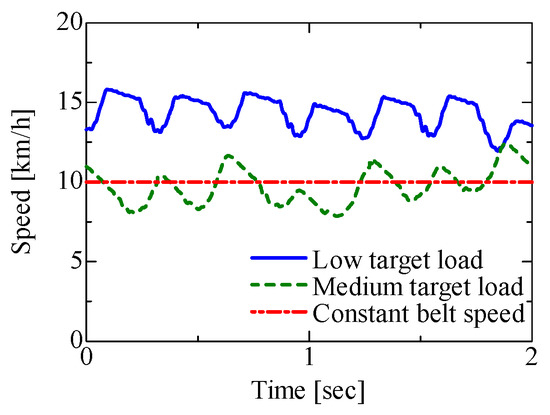 For the vertical forces, these results indicated a similar trend in all results. For the propulsion forces, the result of load control mode in the low target load value indicated a brake force (negative value), and the results of constant speed and load control in the medium load value did not indicate a brake force. However, the results of load control in the medium load value indicated a high propulsion force against generating speed. In running on an actual road, the ground reaction force of the propulsion and brake forces are generated. When the belt runs at a constant speed, participants may not always generate the propulsion forces because the belt works automatically. However, the propulsion forces are always generated on an actual road. Therefore, these results indicate that the load control in the low target value can be closer to running on an actual road.
