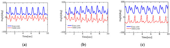 Results for right joint angles in gait conditions: (a) low target load; (b) medium target load; (c) high target load.