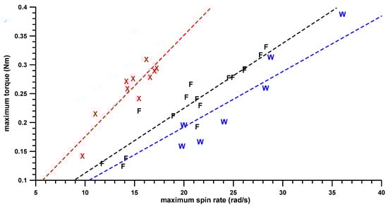 Maximum torque against maximum spin rate; dashed line = gradient of a through-origin fit (times 100 = average bowling potential of each group): X = fast bowlers, F = finger-spinners, W = wrist-spinners.