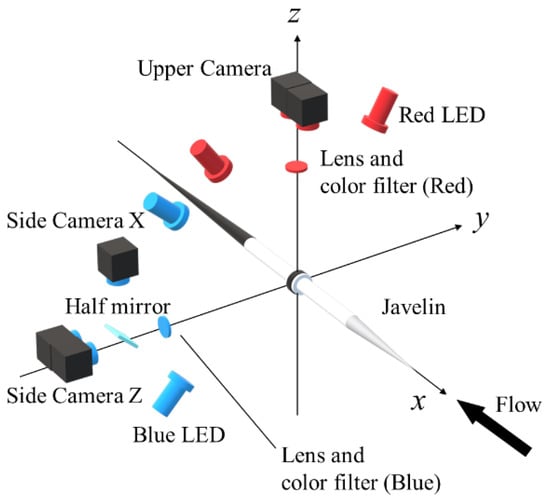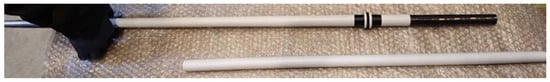 A full-size women’s javelin was employed for the wind tunnel tests. The length of the javelin used was 2213 mm, and the center of gravity was at 920 mm from the tip. Most of the surface of the javelin was painted white by a spray, as shown in Figure 1. This was for detecting the position, the details of which are described in the next section. For the same reason, a 15-mm-long collar was attached to the javelin at the center of gravity, and a 5-mm-wide black tape was wrapped around the javelin at the center of gravity.