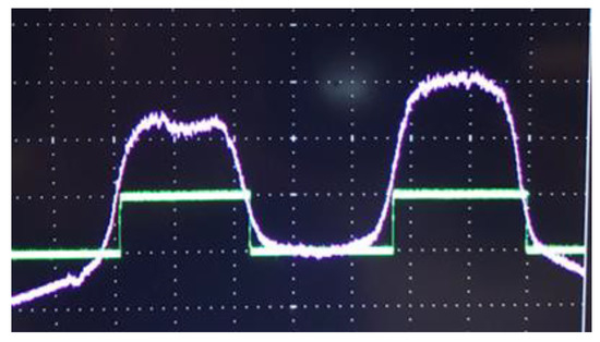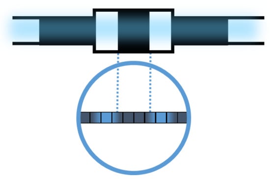 Side camera X, shown in Figure 2, was used to detect the x-position of the javelin. The color filter meant the camera detected only the blue light reflected from the javelin. A schematic illustration around the collar is shown in Figure 3. Side camera X was an optical line sensor with a row of 7450 CCD elements. The boxes inside the circle in Figure 3 show the CCD elements. The blue and gray elements indicate those elements detecting and those not detecting blue light reflected from the javelin, respectively. The output signal from Side camera X is shown by the pink line in Figure 4. The abscissa is the CCD element number, and the ordinate is the brightness. The white part of the collar corresponds to high brightness, while the black part corresponds to low brightness. In order to define the edges between the white and black lines on the collar, the pink line was binarized, as shown by the green line in Figure 4.