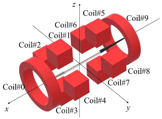Figure 5 shows a schematic diagram of the coil system, in which the coils are numbered from 0 to 9. The model can be levitated by the magnetic forces generated by the coils. Ten coils were used in this experimental setup to control the postion and the attitude of the javelin. For example, coils #0 and #9 worked in the x-direction. The current in the coils controlling the javelin in the x-direction, Ix, is obtained from Equation (1), which gives the average value of the currents in coils #0 (I#0) and #9 (I#9). The curent values for the other axes are defined in the same way.