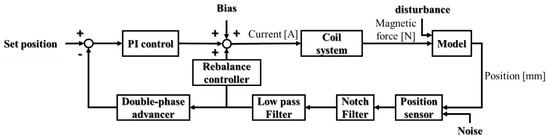 A block diagram of the control system is shown in Figure 6. The signal from the position sensor passed through two filters, which delayed the signal. This time delay was compensated for by a double-phase advancer. In order to reduce the difference between the measured position and the set position, the currents to each of the ten coils were determined by PI (Proportional Integral) control [2].