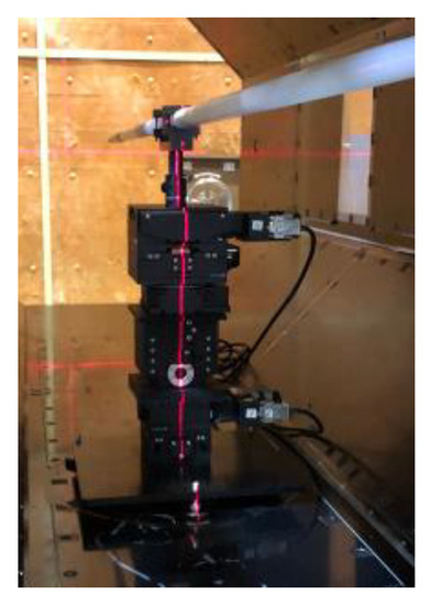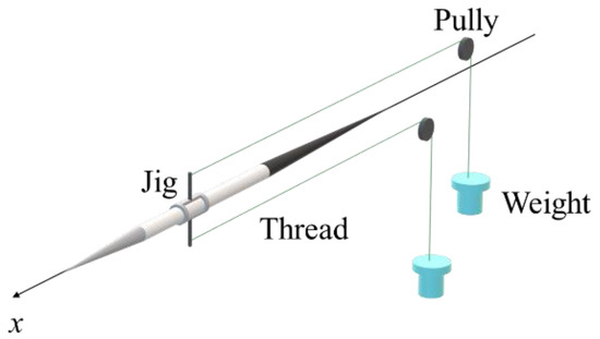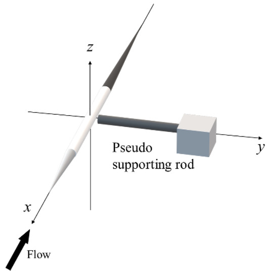 Moreover, the influence of support interference was investigated at AoA of 0°, with the wind speed varied from 20 m/s to 30 m/s. A schematic diagram of the setup is shown Figure 11. Although the javelin was supported by magnetic force, a pseudo supporting rod with a diameter of 20 mm was set 2 mm away from the surface of the javelin. The thickness of the boundary layer around the center of gravity was estimated to be about 4 mm. Therefore, the tip of the pseudo supporting rod penetrated the boundary layer. Although the pseudo supporting rod did not touch the javelin, it was considered to interfere with the measurements, as in a conventional wind tunnel test.