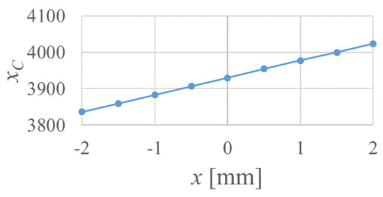 The javelin was fixed on a calibration stage, as shown in Figure 7, and was moved in each direction using the calibration stage. The position of the javelin in the x-direction was determined by the number of the CCD element aligned with the center of gravity. Figure 8 shows the calibration results when the javelin was moved ±2 mm in the x-direction. The abscissa is the actual x position, while the ordinate is the corresponding number of the CCD element, xC. Figure 8 shows that xC is linearly proportional to x. The element number at the center of gravity gives the actual position of the javelin. Each axis was calibrated in the same way.