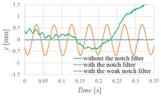 Moreover, the orange line denotes the temporal variation of y with a weak notch filter, i.e., a filter with decreased intensity. The orange line oscillates with time. By decreasing the intensity of the notch filter, oscillation of the javelin, as in real flight, was realized. The frequency of the oscillation was 22 Hz, and the javelin was still under control.