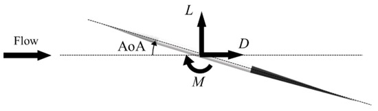 The aerodynamic forces acting on the javelin are depicted in Figure 12. The angle of attack is denoted by AoA, the drag by D, the lift by L, and the pitching moment by M. The time-averaged aerodynamic force coefficients as a function of the angle of attack are shown in Figure 13. The drag coefficient, CD, is given by Equation (2), where ρ is the air density, U is the wind speed, and A is the maximum cross-sectional area. The lift coefficient, CL, is given by a similar equation. The pitching moment coefficient, CM, is given by Equation (3), where l is the length of the javelin. The aerodynamic force coefficients measured with the notch filter (static case) are shown by the closed circles ●, those with the weak notch filter (oscillating case) are shown by the triangles, ▲.