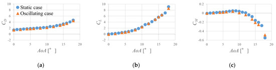 It was found that the differences between the static case and oscillating case for CD and CL were negligibly small. However, the difference in CM became significant above 10°. The pitching moment, CM, for the oscillating case became negative above 10°, and above 12° for the static case. It can be seen that CD and CL increased with increasing the angle of attack up to 18°, whereas CM increased for several degrees, and then decreased.