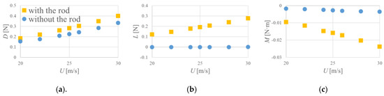 Aerodynamic comparisons between D, L, and M with the pseudo supporting rod and without it as a function of wind speed. AoA = 0°. (a) The drag. (b) The lift. (c) The pitching moment.