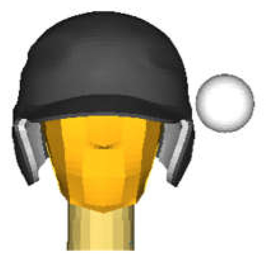 Initial condition of the baseball impact simulation using FE models of the human head, the helmet and the ball.