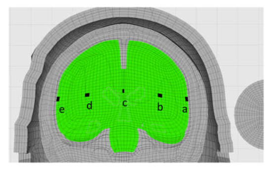 Reconstructive simulations of the impact tests were conducted using the helmet, ball and head-neck FE models (Figure 4). An initial velocity of 129 km/h was input to the ball model, and the ball collided with the lower temporal region of the helmet as shown in Figure 4. Contact definitions were set for balls and helmets and for helmets and skin, respectively. The acceleration responses at the 6DOF sensor locations were obtained. In addition, brain pressure responses at five locations in the brain, from the collision point to the opposite side, were obtained, as shown in Figure 5.