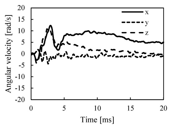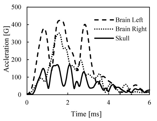 Figure 6 shows the resultant acceleration responses at the skull and left and right cerebrum measured in a baseball impact test. Figure 7 also shows the angular velocity responses measured at the skull sensor. The acceleration responses of the skull and brain showed oscillatory waveforms with a duration of about 4 ms. The rise times of the resultant acceleration waveform at the right and left cerebrum showed earlier than those at the skull, and the maximum value of the accelerations in the cerebra were greater than the value at the skull. The peak change in angular velocity around the sagittal axis, shown as the x-axis in Figure 7, was about 13 rad/s.