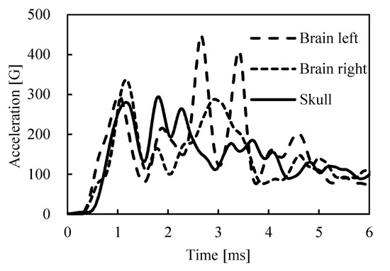 Recent studies on brain injuries in sports have mainly focused on longer-duration impacts such as player collision in football [8]. Based on the results of reconstruction simulations in the football impact cases and traffic accident cases, the rotational motion of a head showed good correlation with the shear deformation of brain tissue, and various injury criteria based on the head’s rotational motion have been proposed [9,10]. However, in the case of the baseball impact, the peak change in angular velocity and maximum principal strain in the brain was lower than in football cases [8]. Rather, there was an increase in brain acceleration due to the pressure wave propagation by the short-duration impact, as described above. The mechanism of intracranial brain deformation in the baseball impact may differ from that of traffic accidents or football cases. Therefore, a new injury criterion and head protection measures might be required, considering the effect of pressure wave propagation in hard ball collision cases, with shorter duration.