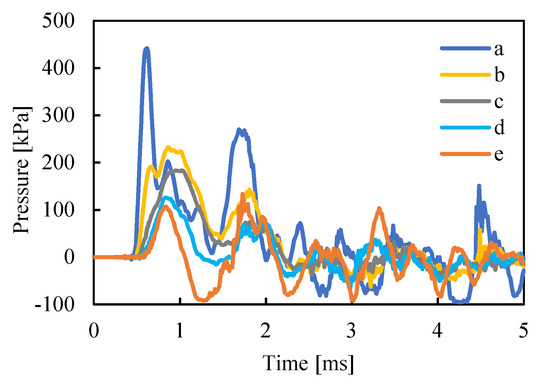 The resultant acceleration responses at the skull and brain sensor locations obtained by finite element analysis are shown in Figure 8. The acceleration waveforms were multimodal, the rise time at the brain sensor locations showed earlier than that at the skull sensor and the maximum value at the brain sensors was higher than the value at the skull. The maximum value of the maximum principal strain in the brain was relatively small: 0.17. Figure 9 shows the brain pressure responses at the five brain elements shown in Figure 5. Firstly, high positive pressure was generated at element a, closest to the collision site, and then the positive pressure rose in the order of elements: b, c, d and e. In addition, at element e (the opposite side of the collision point), after the positive pressure was generated, the sign of the pressure was reversed. The negative pressure reached −100 kPa, close to the CSF cavitation pressure, while the sign of the pressure was repeatedly changed. In terms of the magnitude of negative pressure, elements a and e (near the skull-CSF boundary) reached the cut-off pressure, repeatedly.