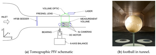 Consistent aerodynamics of association footballs are crucial to enable fair competition in the world’s most popular sport. Many studies have been undertaken to understand how the aerodynamic forces on one football model compare to those on another [,,], or how adding or changing features on a ball can alter the force characteristics [,,,], indicating how sensitive the aerodynamic performance of the ball is to its surface features. Several sources have also investigated what happens to a ball’s aerodynamics when it begins to spin and undergoes either a conventional or a reverse Magnus effect [,,]. These are all useful to quantify the effect that a change will have on the aerodynamic loading (and, hence, flight behaviour) of the ball, but how the surface features on the ball can influence the underlying fluid mechanics is still unclear. This uncertainty means that optimising a football’s aerodynamic performance tends to be based on empirical trends and experience, rather than on an understanding of the fluid mechanics. To begin to develop this understanding, the flow fields must be measured in increasingly quantitative ways.