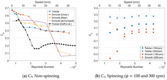 Figure 2a shows the drag coefficient against speed for the smooth sphere and Telstar ball in a non-spinning case with the underneath support. These are compared to smooth sphere data from this test, as well as from Achenbach [] and Telstar data by Goff et al. [], all supported from the rear. The underneath mounting is known to affect the balance measurements [] more than the rear support; this is evident here, but it is unavoidable in a spinning test. The rear-supported smooth ball is close to Achenbach’s data. In both setups, the smooth sphere transitions at a higher speed than the Telstar (Re = 2.5 × 105 and 1.5 × 105, respectively, for the underneath support). It is known that the seeding wing also influences the measured forces due to an increase in upstream turbulence; the presented data are all with the wing in place. Figure 2b shows the side force coefficient with the ball spinning at 100 and 300 rpm. In all cases, the smooth sphere has a lower side force than the Telstar ball and exhibits reverse Magnus effects at 100 rpm, which the Telstar does not.