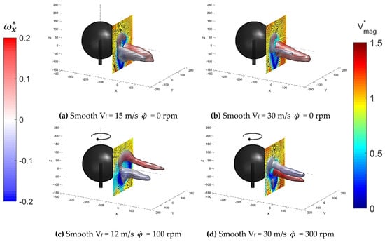 Figure 3 shows the tomographic PIV results for a range of tests using the smooth sphere. They show a plane that is placed half of the ball radius (r) behind the ball and is coloured according to normalised velocity magnitude (Vmag*). The isosurface is based on the normalised λ2 criterion to identify vortex structures (see Jeong and Hussain [] for definition) and is coloured using normalised streamwise vorticity (ωx*). The interesting features here are the two strong vortices shown by the isosurfaces; these are a counter-rotating pair, shown by the opposite vorticity.