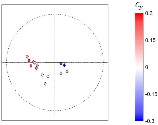 The positions of the vortices move based on the type of Magnus effect experienced; under a conventional Magnus effect (Figure 4b,c,e and f), the vortices move clockwise around the ball; in a case with approximately zero side force (Figure 4d), the vortices are at the bottom of the ball (likely forced by the support), and in a reverse Magnus case (Figure 4a), the vortices move anti-clockwise around the ball. Figure 5 shows the mean position of the two vortices in each of the test cases, coloured by Cy. This position correlates well with the measured Cy value in each case.