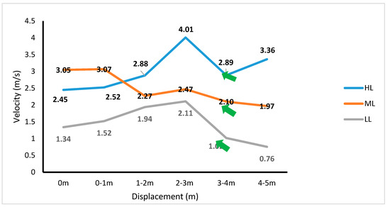 In Figure 3, it is possible to observe the horizontal velocity, where the HL during the take-off performed at a higher velocity than the other athletes (green arrow). The increase that the roller skaters reached at 2–3 m of the horizontal displacement represents the lower and upper limbs’ contribution before to the take-off.
